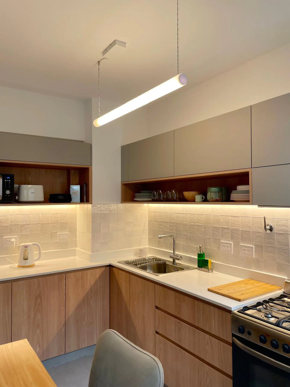 Este colgante lineal está hecho en tubo de acrílico blanco opal de alta calidad y contiene una tira LED cálida de 3000K (14,4W), ideal para generar una luz suave y envolvente. Incluye fuente/driver